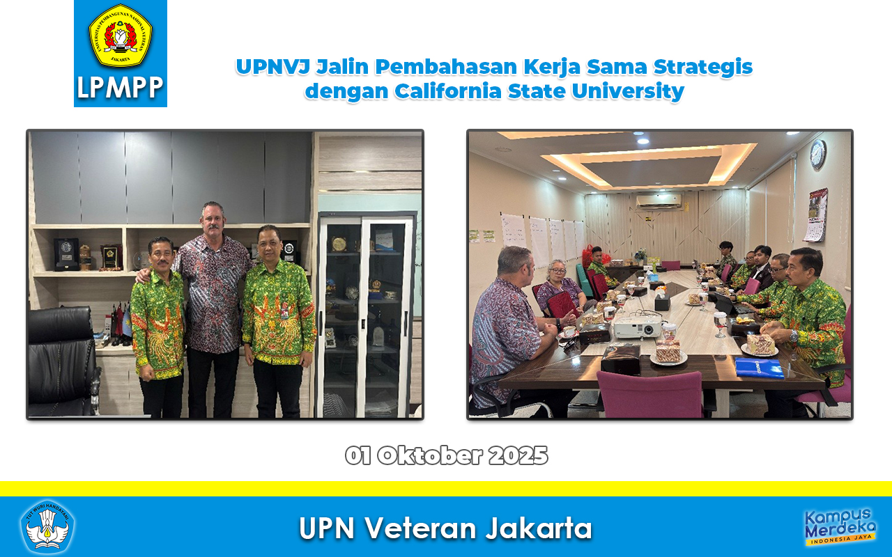 Jakarta – Universitas Pembangunan Nasional “Veteran” Jakarta (UPNVJ) terus memperkuat langkah internasionalisasinya melalui perluasan jejaring dan kolaborasi akademik dengan perguruan tinggi luar negeri. Salah satu upaya strategis tersebut diwujudkan dalam pertemuan dengan California State University (CSU), USA, yang berlangsung pada Rabu, 1 Oktober 2025 di Ruang N3 UPNVJ.