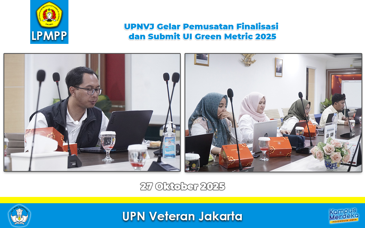 Sebagai langkah strategis menuju target tersebut, UPNVJ menyelenggarakan kegiatan Pemusatan Finalisasi dan Submit UI Green Metric Tahun 2025 pada Senin, 27 Oktober 2025, bertempat di Ruang Nusantara 1A, Gedung Rektorat Lantai 2. Kegiatan berlangsung sejak pukul 08.00 hingga 17.00 WIB dan dipimpin langsung oleh Kepala Pusat Data, Informasi, dan Pemeringkatan UPNVJ.
