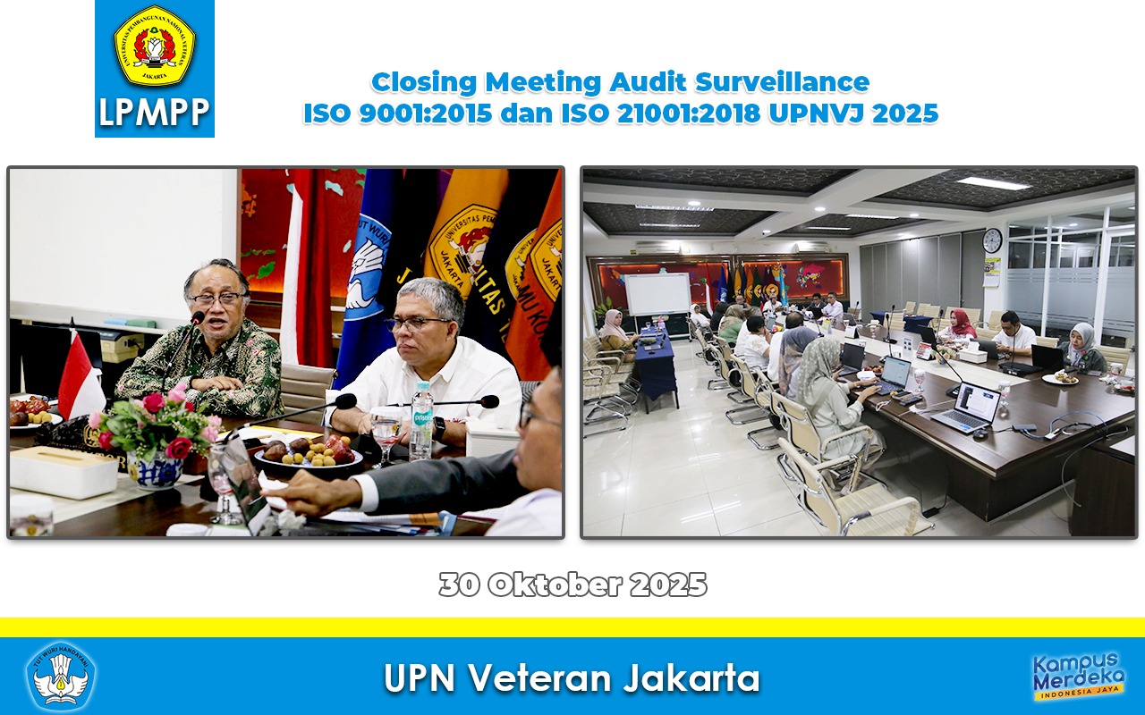 Jakarta, 30 Oktober 2025 – Universitas Pembangunan Nasional “Veteran” Jakarta (UPNVJ) terus menunjukkan komitmennya terhadap peningkatan mutu tata kelola dan sistem manajemen pendidikan dengan menyelenggarakan Closing Meeting Audit Surveillance ISO 9001:2015 dan ISO 21001:2018, pada Kamis, 30 Oktober 2025, bertempat di Ruang Nusantara 1A, Gedung Rektorat UPNVJ. Kegiatan ini merupakan penutup dari rangkaian proses audit yang telah dilaksanakan selama dua hari, sejak Rabu, 29 Oktober 2025, bersama lembaga sertifikasi PT. Decra Group Indonesia.
