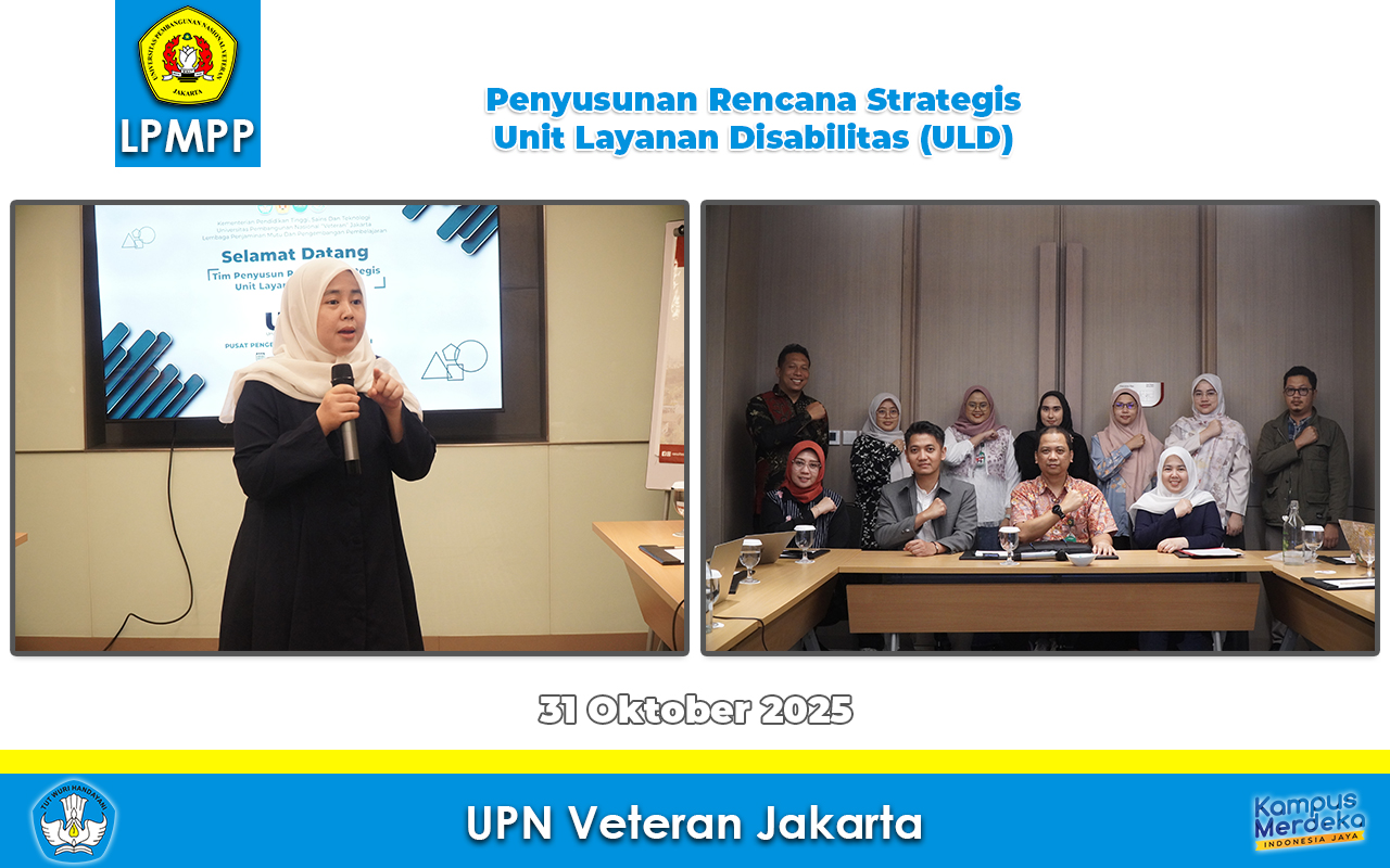Jakarta, 31 Oktober 2025 – Sebagai wujud nyata komitmen dalam mendukung pendidikan inklusif, Universitas Pembangunan Nasional “Veteran” Jakarta (UPNVJ) menyelenggarakan kegiatan Penyusunan Rencana Strategis Unit Layanan Disabilitas (ULD) pada Jumat, 31 Oktober 2025. Kegiatan yang berlangsung di RA Suites Simatupang, Jakarta Selatan ini diadakan secara penuh sehari (fullday) dengan melibatkan berbagai unsur penting dari lingkungan kampus.