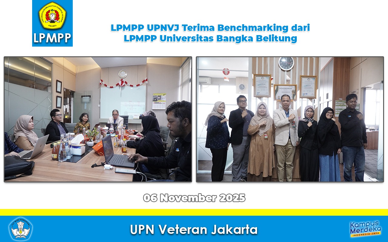 Jakarta, 06 November 2025 – Lembaga Penjaminan Mutu dan Pengembangan Pembelajaran (LPMPP) Universitas Pembangunan Nasional “Veteran” Jakarta menerima kunjungan benchmarking dari LPMPP Universitas Bangka Belitung (UBB) dalam rangka memperkuat tata kelola penjaminan mutu pendidikan tinggi. Kegiatan berlangsung di Ruang Rapat LPMPP Kampus Pondok Labu dan diikuti oleh pimpinan serta tim pengelola penjaminan mutu dari kedua perguruan tinggi.