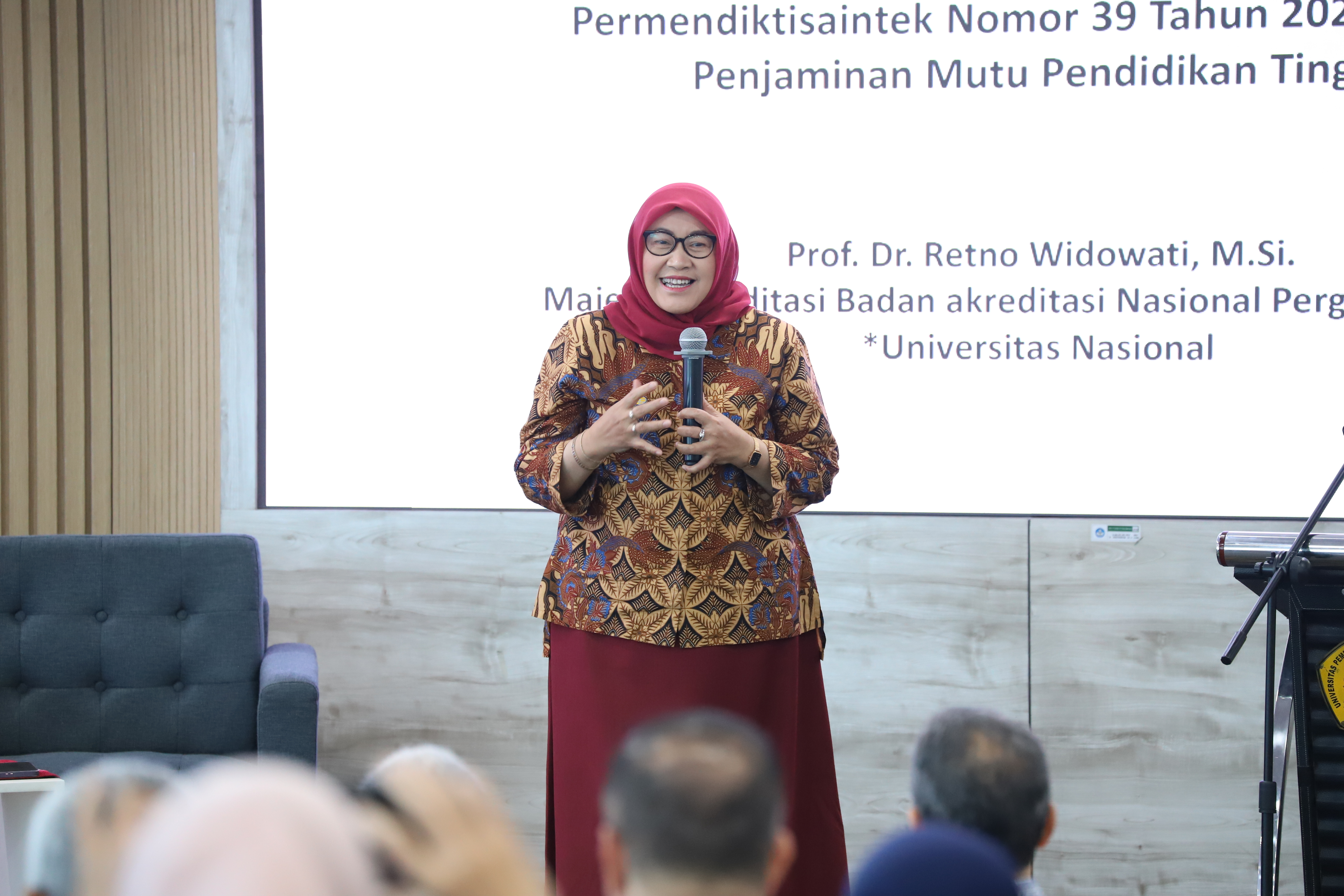 Moderator dari UPNVJ memfasilitasi jalannya sesi dengan pendekatan yang mendorong terjadinya dialog konstruktif. Diskusi berlangsung aktif, di mana peserta mengajukan pertanyaan terkait kesiapan institusi, penyesuaian dokumen mutu, serta strategi penguatan siklus PPEPP (Penetapan, Pelaksanaan, Evaluasi, Pengendalian, dan Peningkatan Mutu). Suasana forum menjadi semakin kaya karena setiap masukan tidak berhenti pada tataran konseptual, melainkan langsung berkaitan dengan kebutuhan implementatif di tingkat program studi dan unit pengelola program akademik.