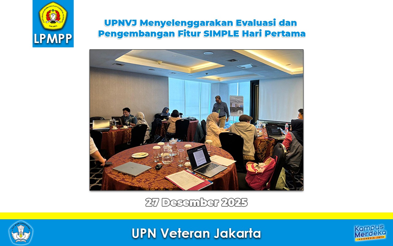 Jakarta, 27 November 2025 – Lembaga Penjaminan Mutu dan Pengembangan Pembelajaran (LPMPP) Universitasi Pembangunan Nasional “Veteran” Jakarta (UPNVJ) menyelenggarakan kegiatan Evaluasi dan Pengembangan Fitur Sistem Informasi Proses Pembelajaran (SIMPEL) pada hari Kamis, 27 November 2025 di Hotel Aston Simatupang. Kegiatan ini dihadiri oleh Kepala LPMPP, Sekretaris LPMPP, Kepala Pusat Pembelajaran, Tim Teknologi Informasi dan Komunikasi (TIK), user support SIMPEL dari setiap fakultas, serta tim pengembangan pembelajaran.