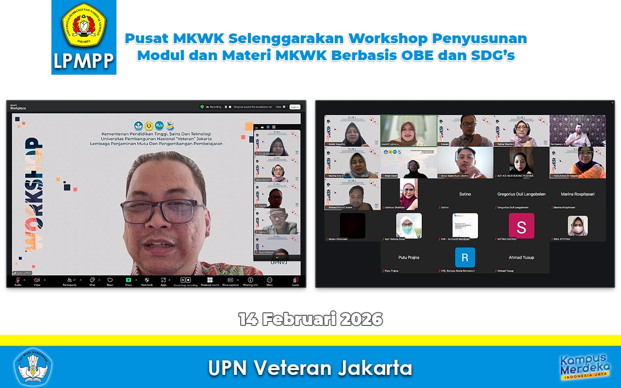 Lembaga Penjaminan Mutu dan Pengembangan Pembelajaran (LPMPP) Universitas Pembangunan Nasional “Veteran” Jakarta (UPNVJ) menyelenggarakan Workshop Penyusunan Modul dan Materi Mata Kuliah Wajib Kurikulum (MKWK) pada Sabtu, 14 Maret 2026. Kegiatan ini dilaksanakan secara daring melalui Zoom Meeting dan diikuti oleh dosen pengampu MKWK, koordinator MKWK, serta tim pengembang kurikulum universitas.