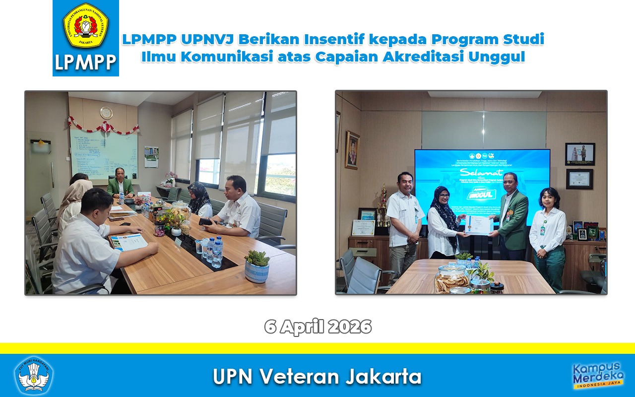 Jakarta, 06 April 2026 — Lembaga Penjaminan Mutu dan Pengembangan Pembelajaran (LPMPP) Universitas Pembangunan Nasional “Veteran” Jakarta (UPNVJ) melaksanakan kegiatan pemberian insentif kepada Program Studi Ilmu Komunikasi, Fakultas Ilmu Komunikasi dan Ilmu Politik, atas keberhasilannya meraih capaian akreditasi unggul. Kegiatan ini berlangsung di ruang rapat LPMPP lantai 4 UPNVJ.