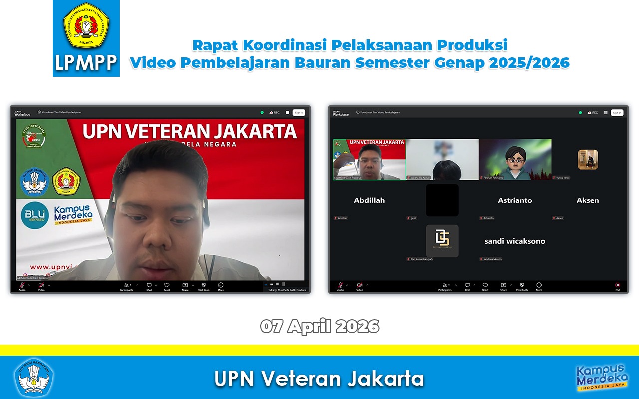 Jakarta – Lembaga Penjaminan Mutu dan Pengembangan Pembelajaran (LPMPP) Universitas Pembangunan Nasional “Veteran” Jakarta (UPNVJ) melaksanakan rapat koordinasi terkait pelaksanaan Produksi Video Pembelajaran Bauran Semester Genap Tahun Akademik 2025/2026. Kegiatan ini diselenggarakan secara daring melalui platform Zoom Meeting dan diikuti oleh seluruh tim produksi video pembelajaran.