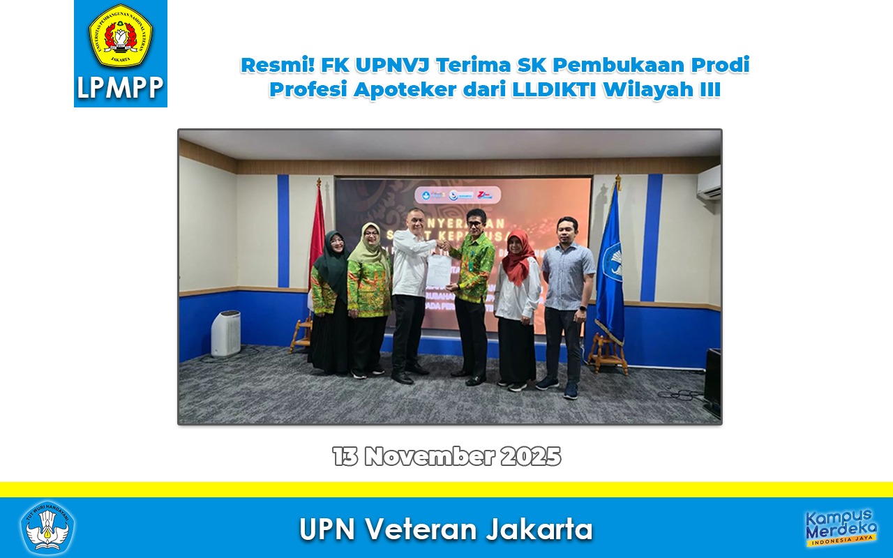 Jakarta, 12 November 2025 — Fakultas Kedokteran Universitas Pembangunan Nasional “Veteran” Jakarta (UPNVJ) resmi menerima Surat Keputusan (SK) Pembukaan Program Studi Profesi Apoteker dari Lembaga Layanan Pendidikan Tinggi (LLDIKTI) Wilayah III Jakarta. Penyerahan...